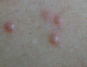 毛囊炎初发时常为散在性,形状如同米粒大小,呈鲜红色或深红色毛囊性丘疹,其贯穿毛发,周缘有炎性红晕,随后迅速变成脓疱,但不互相融合。