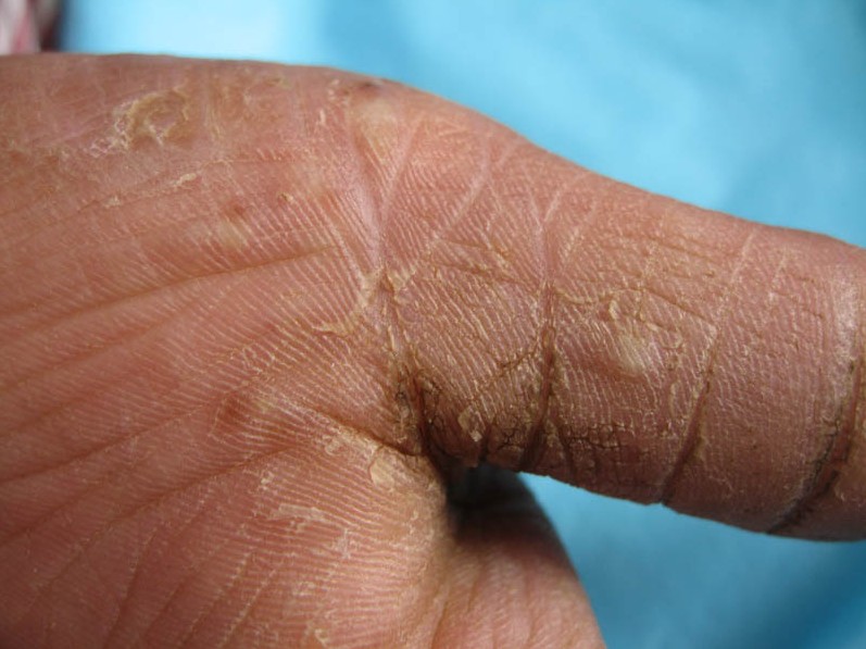 手癣主要由红色毛癣菌(约占55.6(@@@))、须癣(石膏样)、毛癣菌(约占22.7(@@@))等感染引起。本病主要通过接触传染,手癣感染的重要诱因有双手长期浸水、摩擦受伤、接触洗涤剂和溶剂等,故手癣在某些行业中发病率可相当高,患者以青年和中年妇女为多。