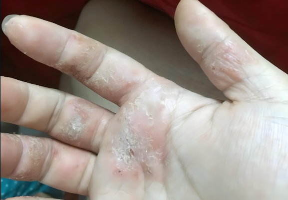 起病于手掌某一部位,缓慢扩大,最终累及大部或全部甚至两侧手掌。 损害为红斑、水疱、鳞屑和角化增厚。
